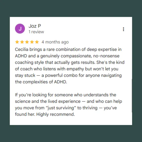 In just three months, everything started to shift. We worked on understanding her ADHD brain, using flexible systems that matched her energy instead of fighting it. She quit smoking, left a toxic environment, and began living from her values... not just survival mode.